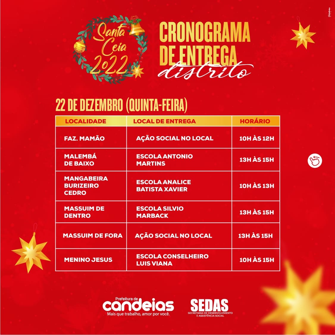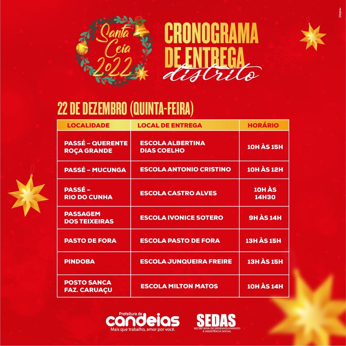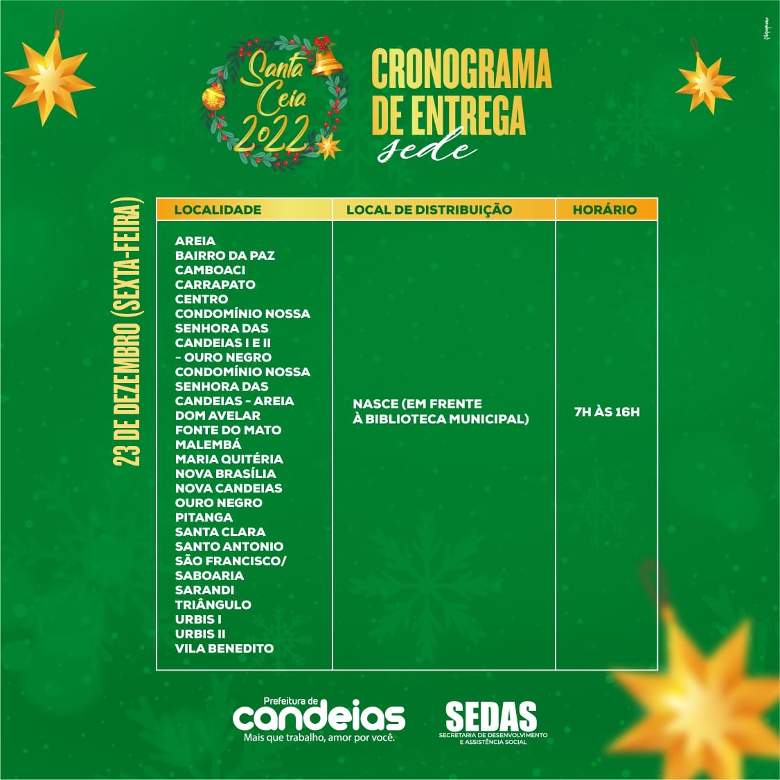 As distribuições agora serão, 22/12, em todos os distritos e 23/12 na sede, seguindo os mesmos horários e locais do cronograma divulgado anteriormente.